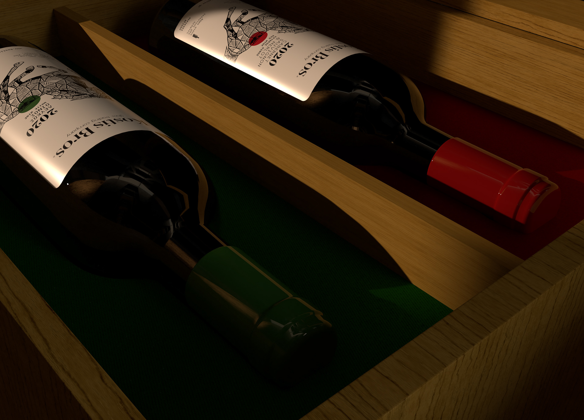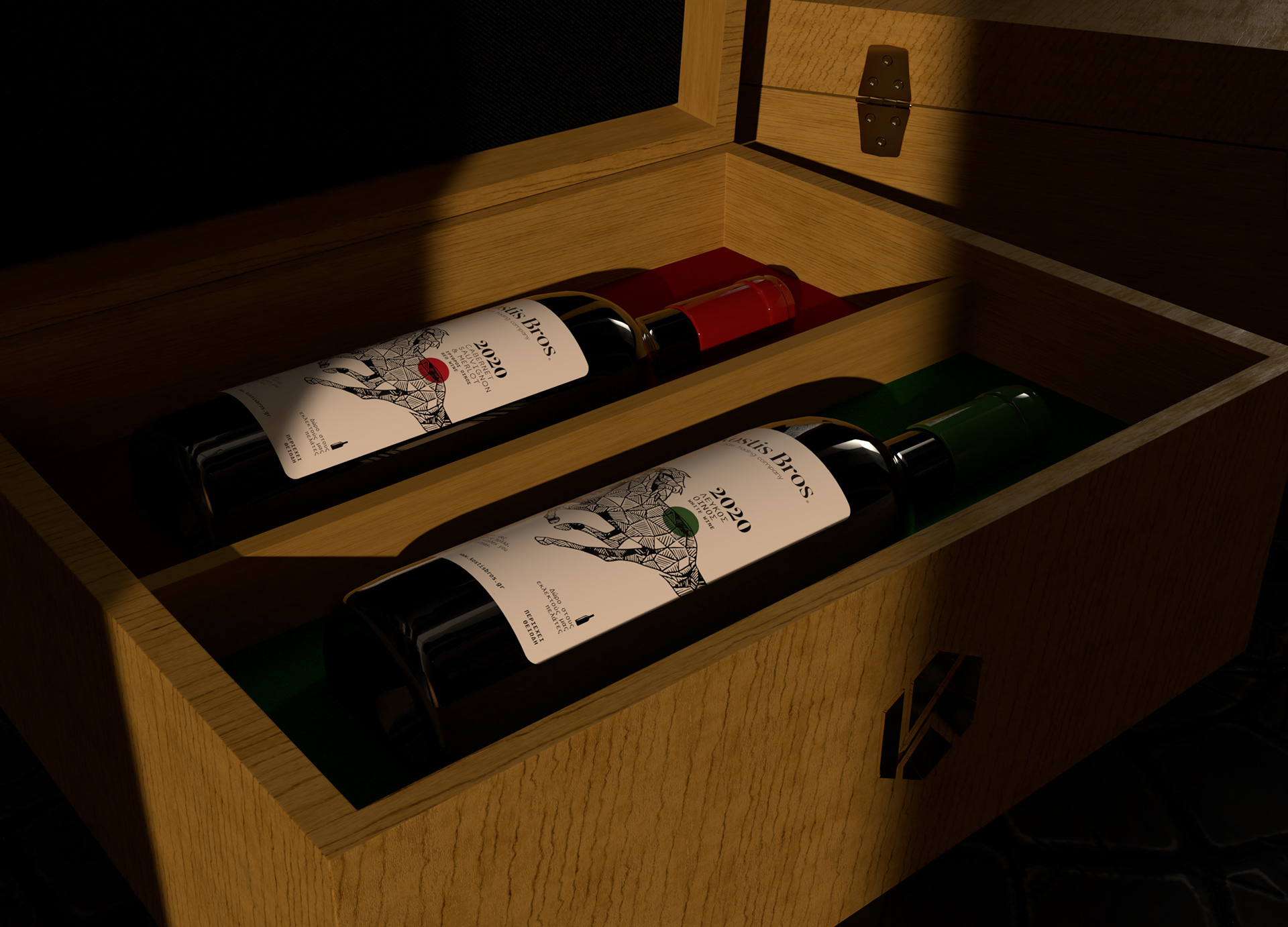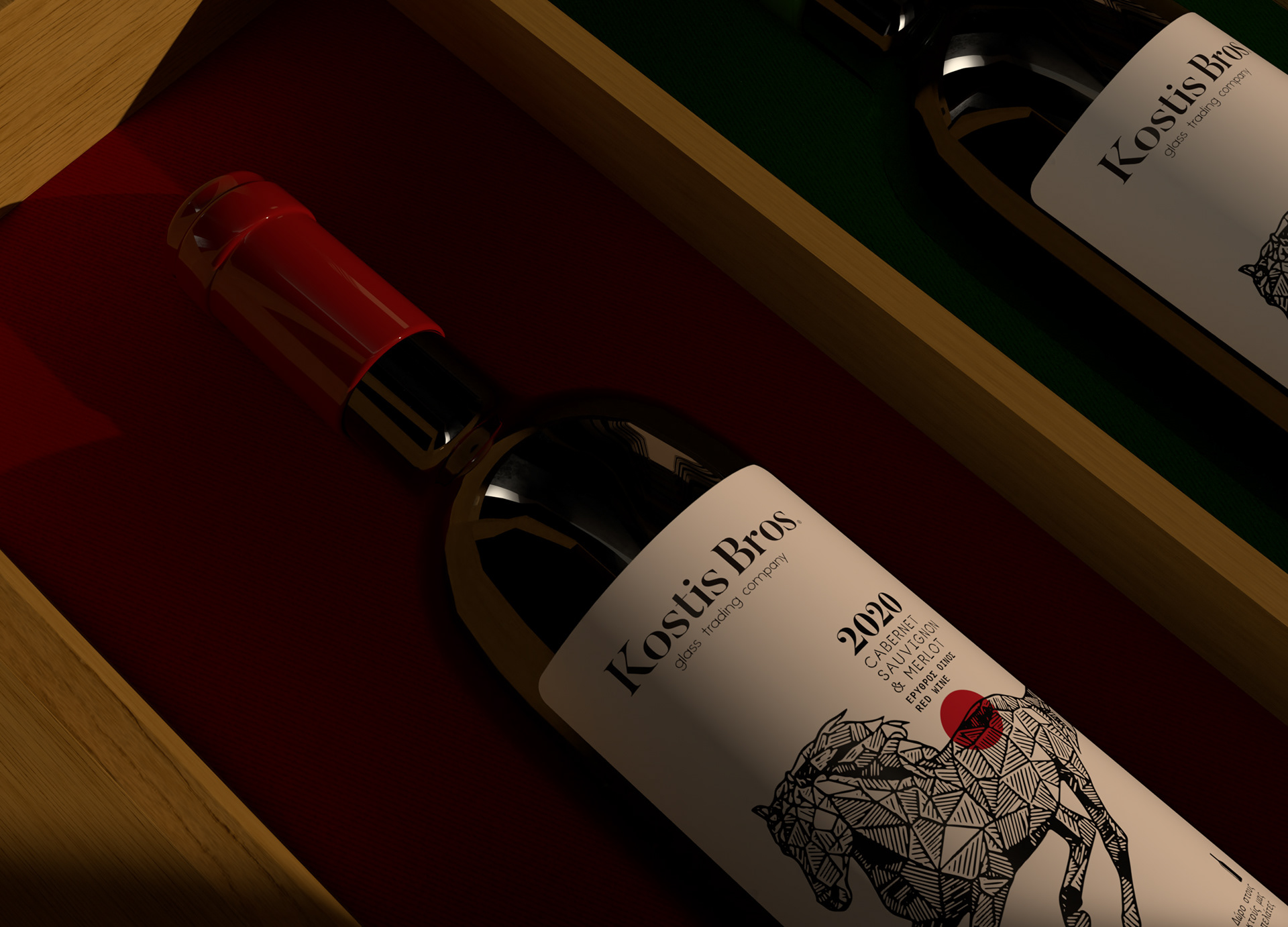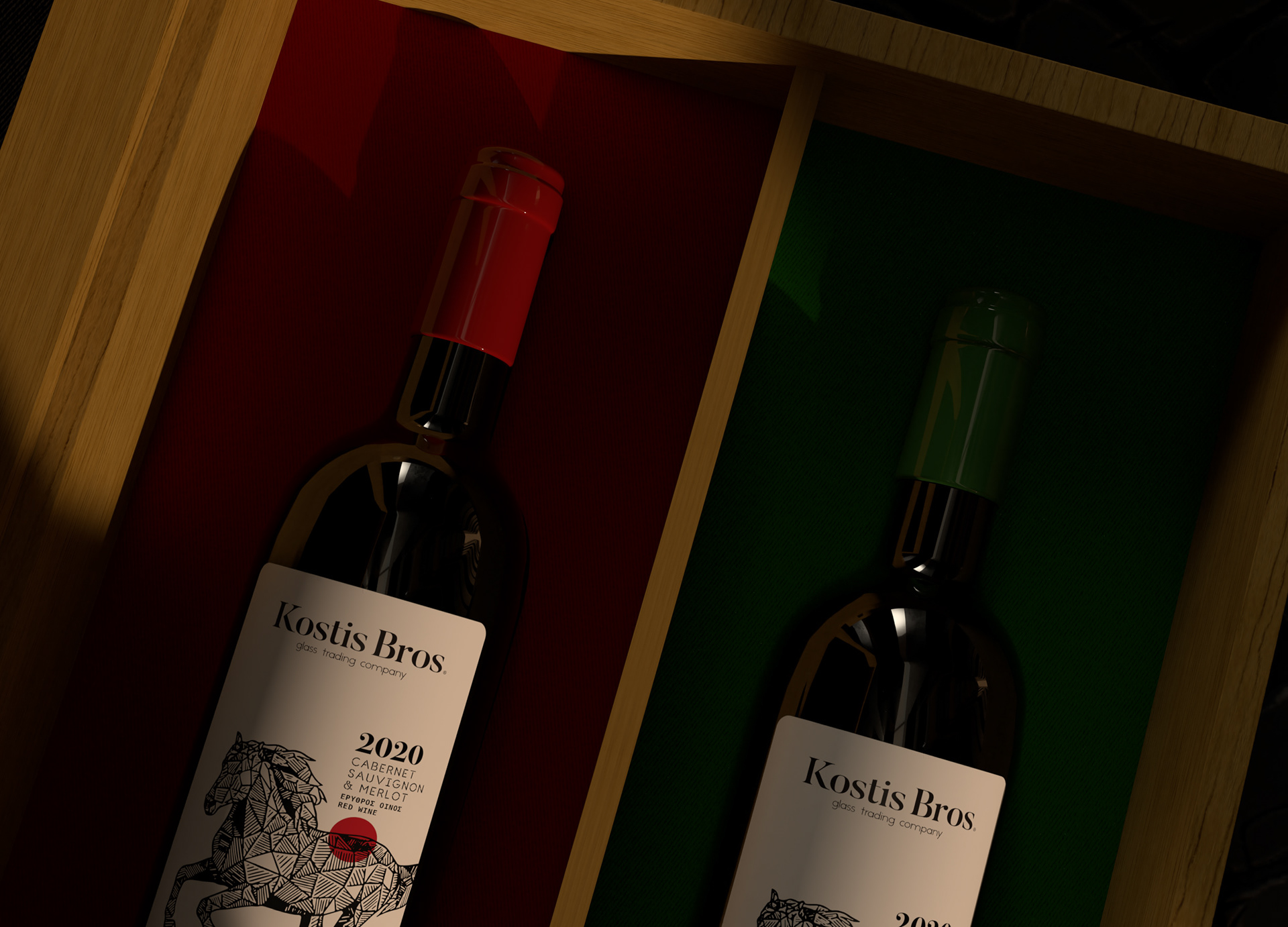 The anniversary wine bottles and the box were designed as a collector’s edition and as an expression of gratitude towards the clients of Kostis Bros. A custom wooden case, engraved with the company’s emblem, presents and protects two premium wine bottles: a red blend of Cabernet Sauvignon and Merlot, and a white Chardonnay. The interior features contrasting linings in deep red and green that highlight each bottle, while the labels are defined by geometric illustrations and precise typography, bridging modern aesthetics with the timeless tradition of wine. The project embodies elegance, authenticity and gratitude, marking a milestone in the company’s history.