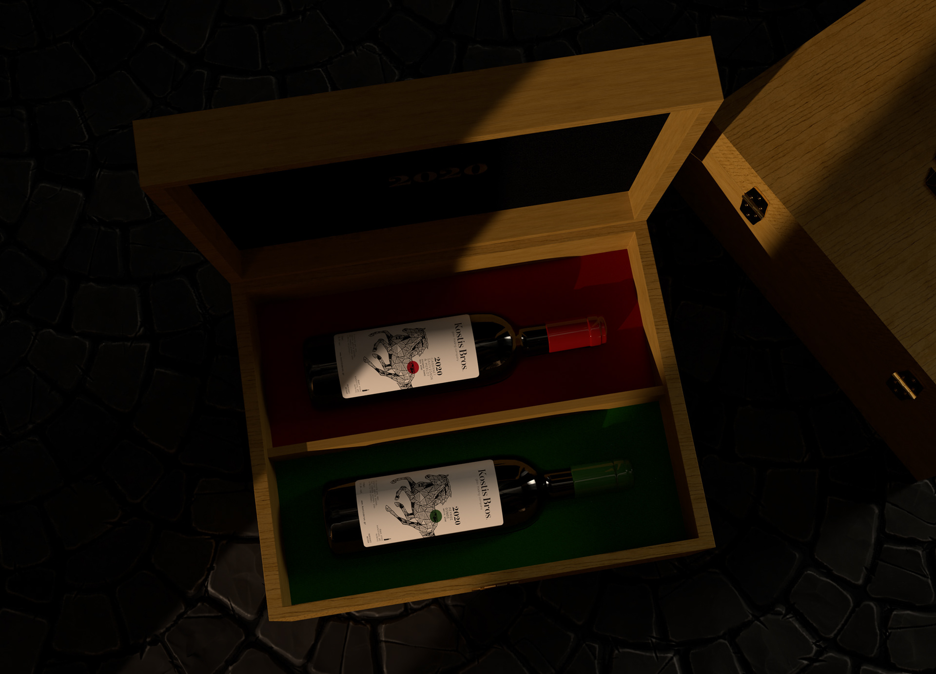 Οι επετειακές φιάλες κρασιού και το κουτί σχεδιάστηκαν ως συλλεκτική έκδοση και ως μια έκφραση ευγνωμοσύνης προς τους πελάτες της Kostis Bros. Η ειδικά διαμορφωμένη ξύλινη κασετίνα, χαραγμένη με το έμβλημα της εταιρείας, παρουσιάζει και προστατεύει δύο εκλεκτές φιάλες: ένα ερυθρό χαρμάνι Cabernet Sauvignon και Merlot και ένα λευκό Chardonnay. Το εσωτερικό επενδύεται με κόκκινο και πράσινο ύφασμα που αναδεικνύει το περιεχόμενο, ενώ οι ετικέτες χαρακτηρίζονται από γεωμετρικές εικονογραφήσεις και αυστηρή τυπογραφία, συνδέοντας τη σύγχρονη αισθητική με τη διαχρονικότητα του κρασιού. Το έργο εκφράζει κομψότητα, αυθεντικότητα και εκτίμηση, αποτελώντας ένα ορόσημο στην ιστορία της εταιρείας.