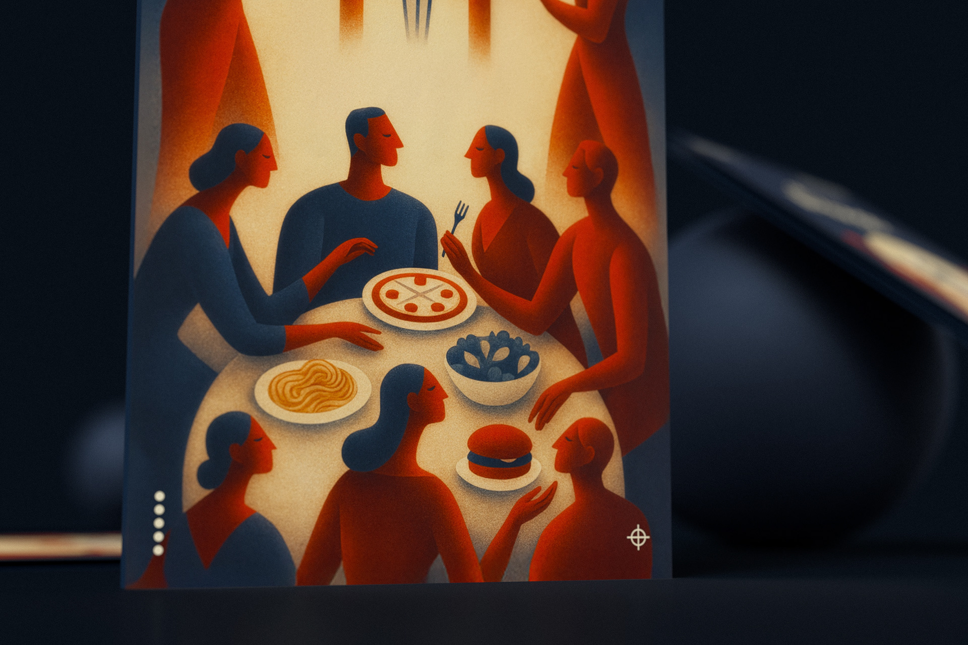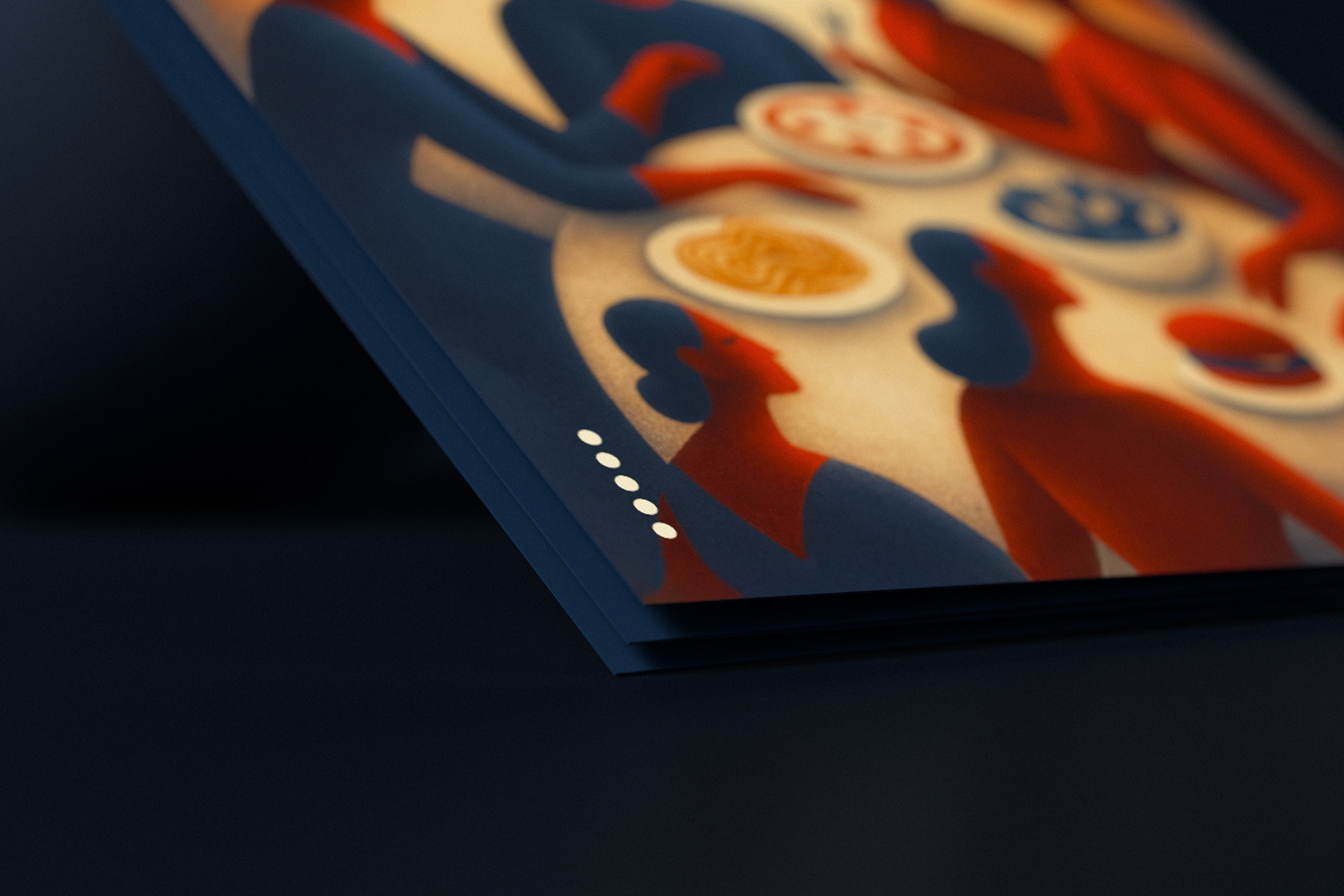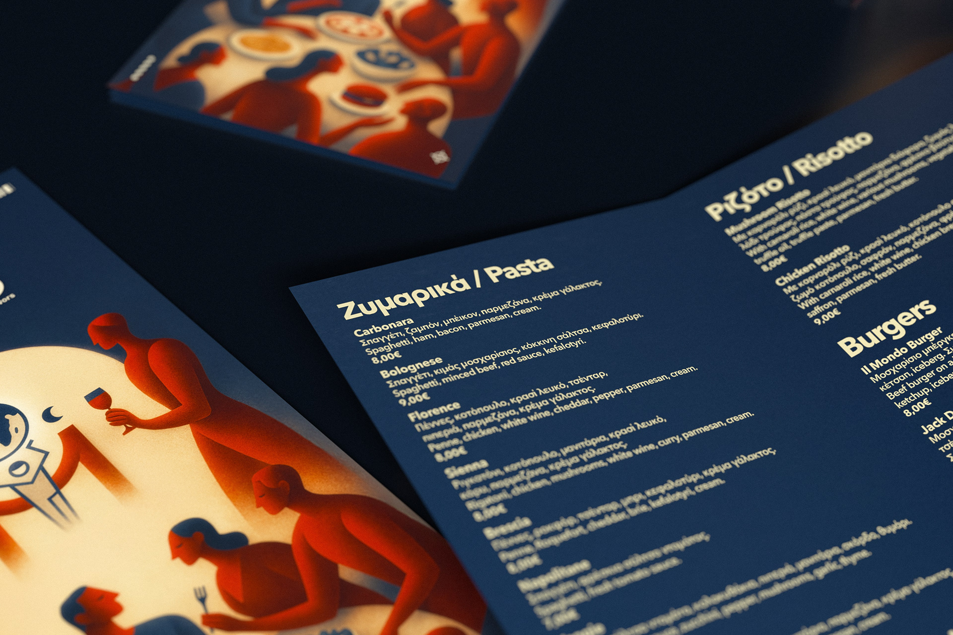 The cover visuals draw inspiration from modern surrealism and are conceptually divided into two thematic axes. The upper section connects to the beverage experience through two human figures, while the lower section focuses on food and dining. Illustration and color work together to form a cohesive visual narrative that reflects the full spectrum of the Il Mondo experience.
