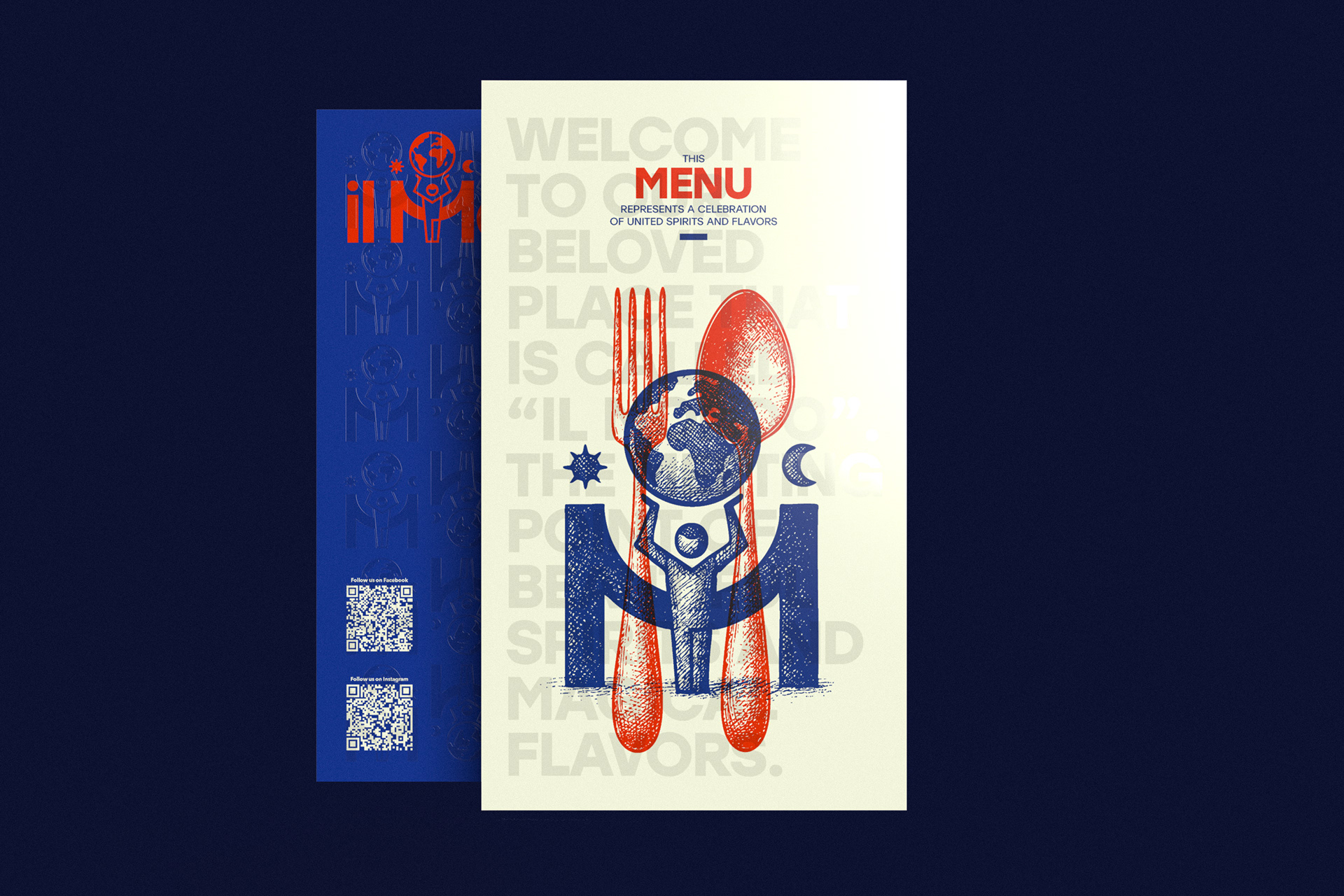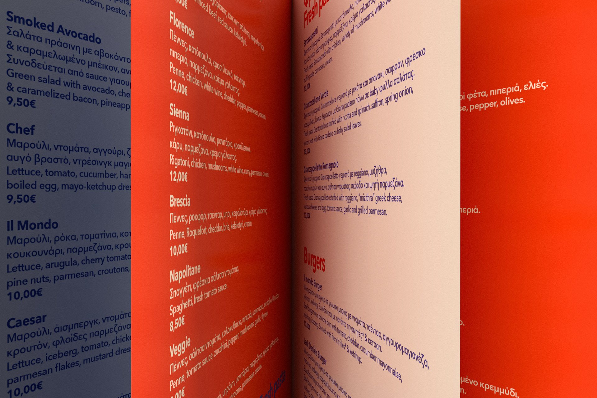 Το μενού του Il Mondo σχεδιάστηκε ως έντυπο με βάση την εικόνα, το χρώμα και το υλικό. Η προσέγγιση είναι άμεση και καθαρή, με στόχο τη σωστή ανάγνωση και τη λειτουργικότητα. Η εικονογράφηση καθορίζει το ύφος, ενώ η τυπογραφία κρατά το περιεχόμενο οργανωμένο.