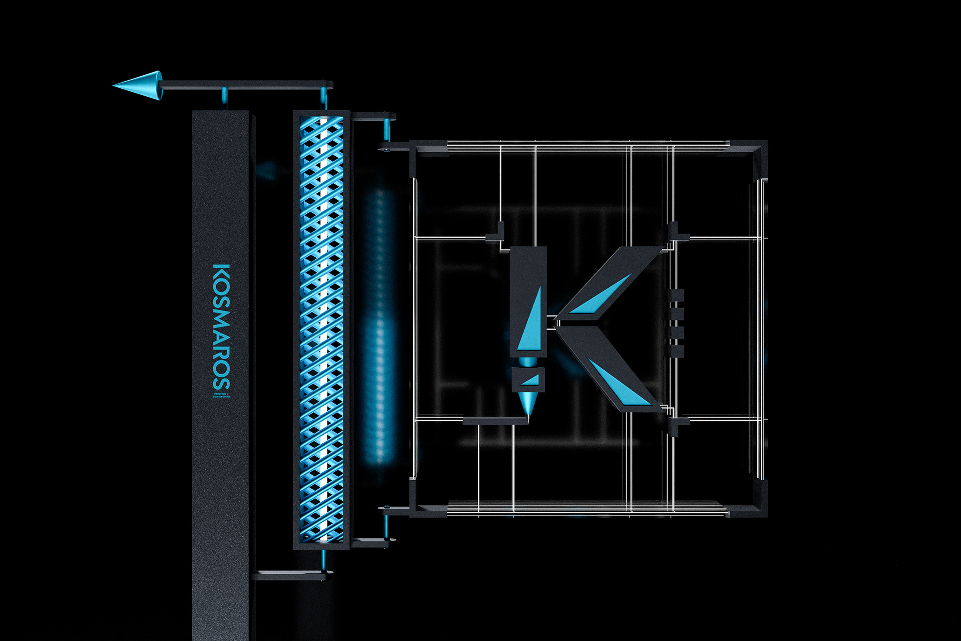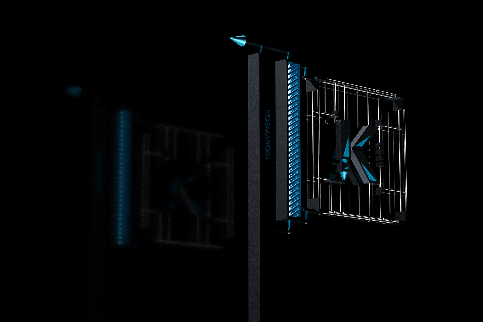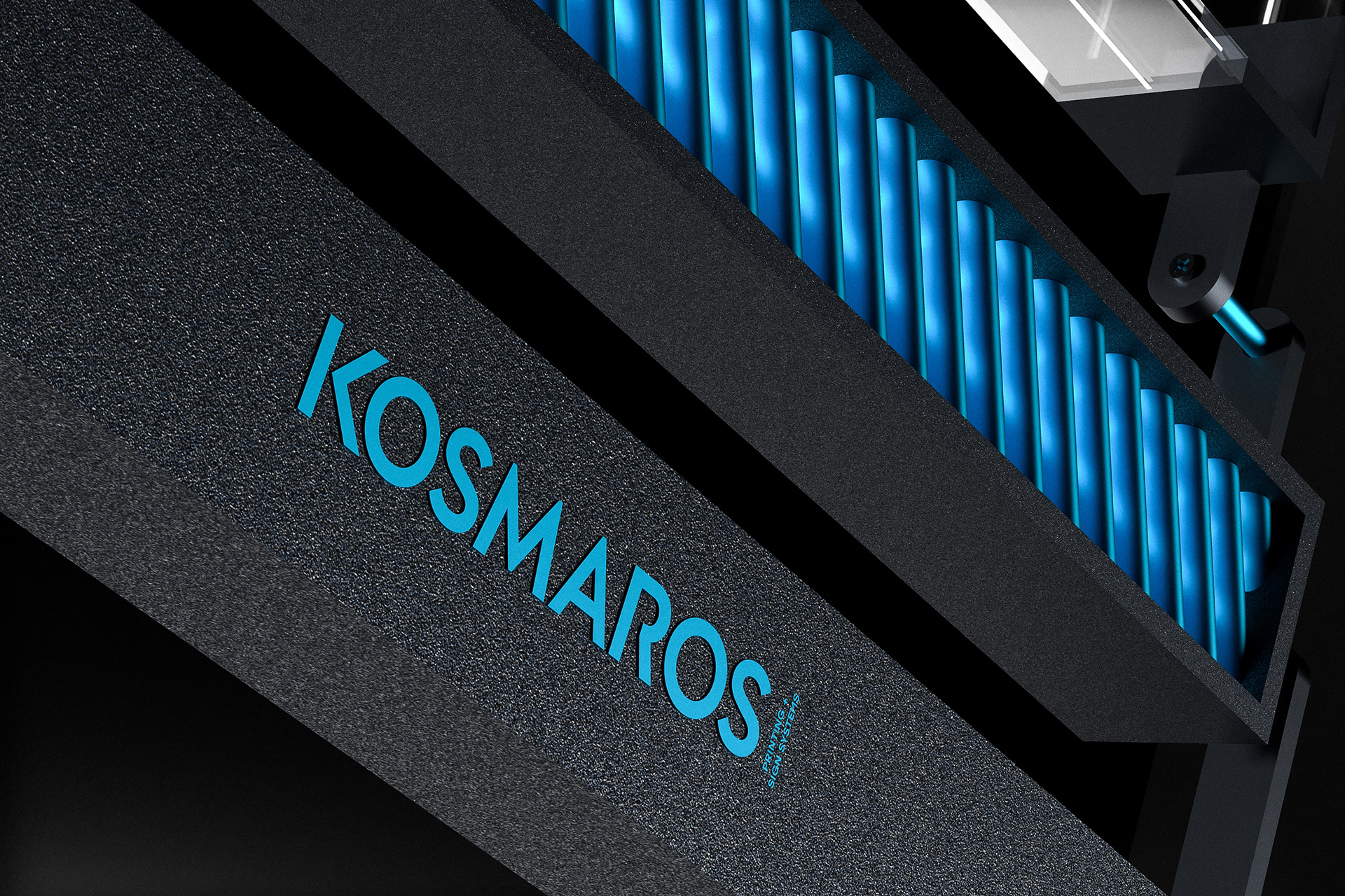 Ο σχεδιασμός του λογοτύπου για την Kosmaros βασίζεται σε ένα γεωμετρικό έμβλημα με καθαρή δομή και οπτική ισορροπία. Το σύμβολο σχηματίζεται από κοφτές γωνιακές επιφάνειες και ελεγχόμενα κενά που δημιουργούν μια δυναμική μορφή με έντονη αναγνωρισιμότητα. Το έμβλημα λειτουργεί ως κατασκευασμένο σήμα που συνδέεται με τον τεχνικό χαρακτήρα της εκτύπωσης, της κοπής βινυλίου και της παραγωγής επιγραφών.