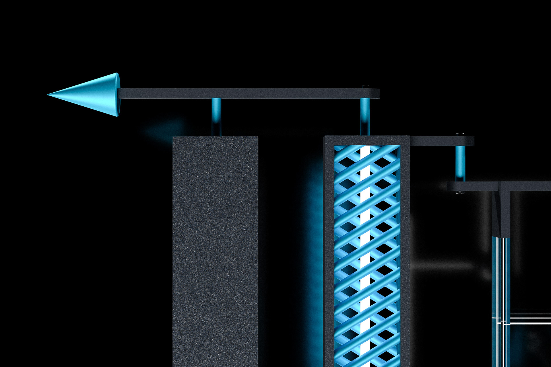 Για να εξερευνηθεί η ταυτότητα σε φυσικό περιβάλλον, το λογότυπο μεταφράστηκε σε μια concept φουτουριστική επιγραφή. Διαφανείς επιφάνειες, δομικά πλαίσια και γραμμικοί οδηγοί δημιουργούν ένα περιβάλλον όπου το έμβλημα εμφανίζεται ως κατασκευασμένο αντικείμενο. Η προσέγγιση αυτή συνδέει την οπτική ταυτότητα με τον πραγματικό κόσμο της κατασκευής επιγραφών.