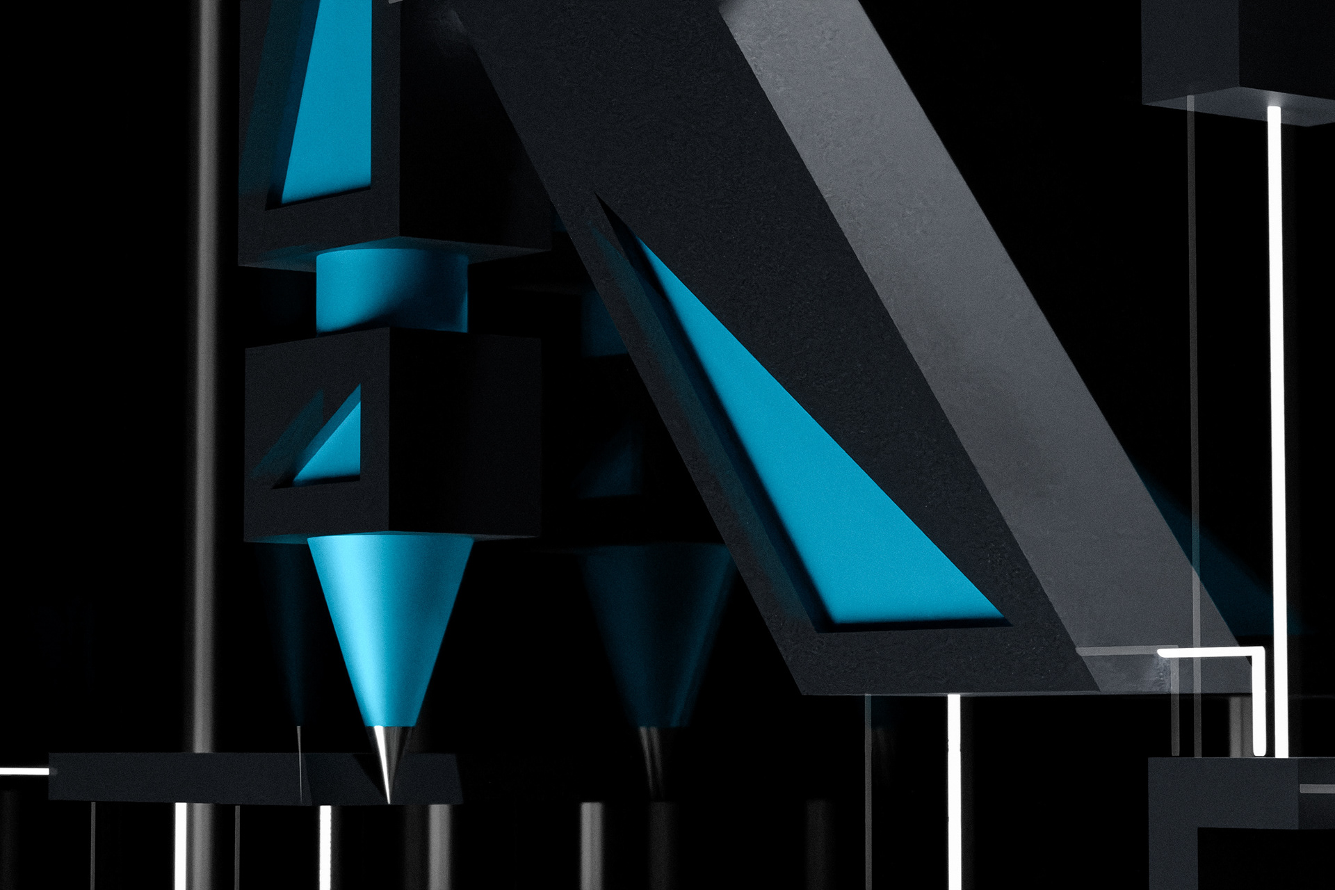 The composition follows a disciplined geometric logic. Triangular openings and angled surfaces introduce direction and suggest processes such as cutting, shaping, and material transformation. Subtle corner reference elements reinforce the technical nature of the identity, visually connecting the emblem with alignment, measurement, and production precision.