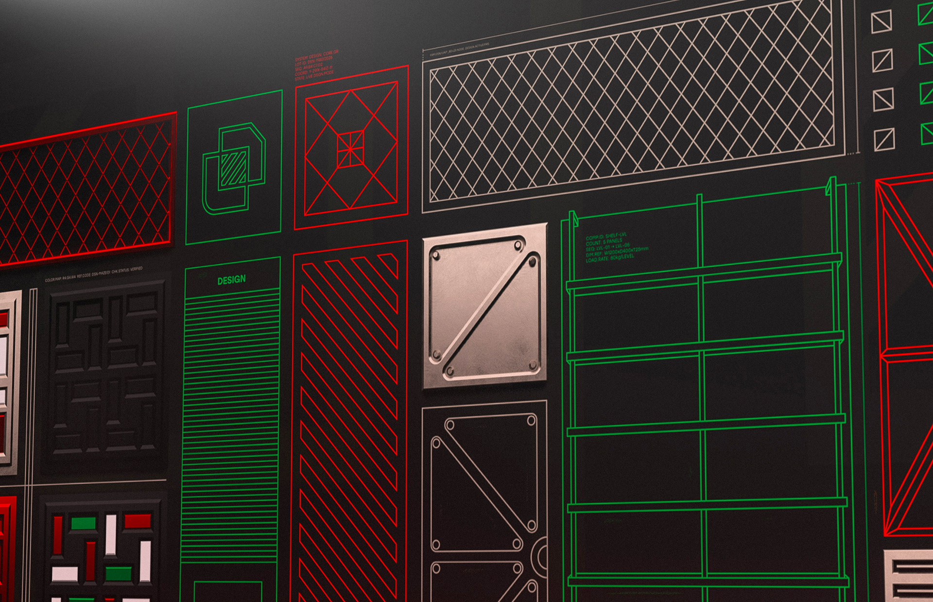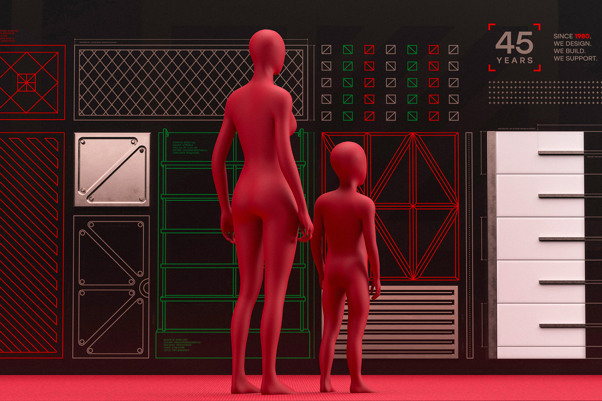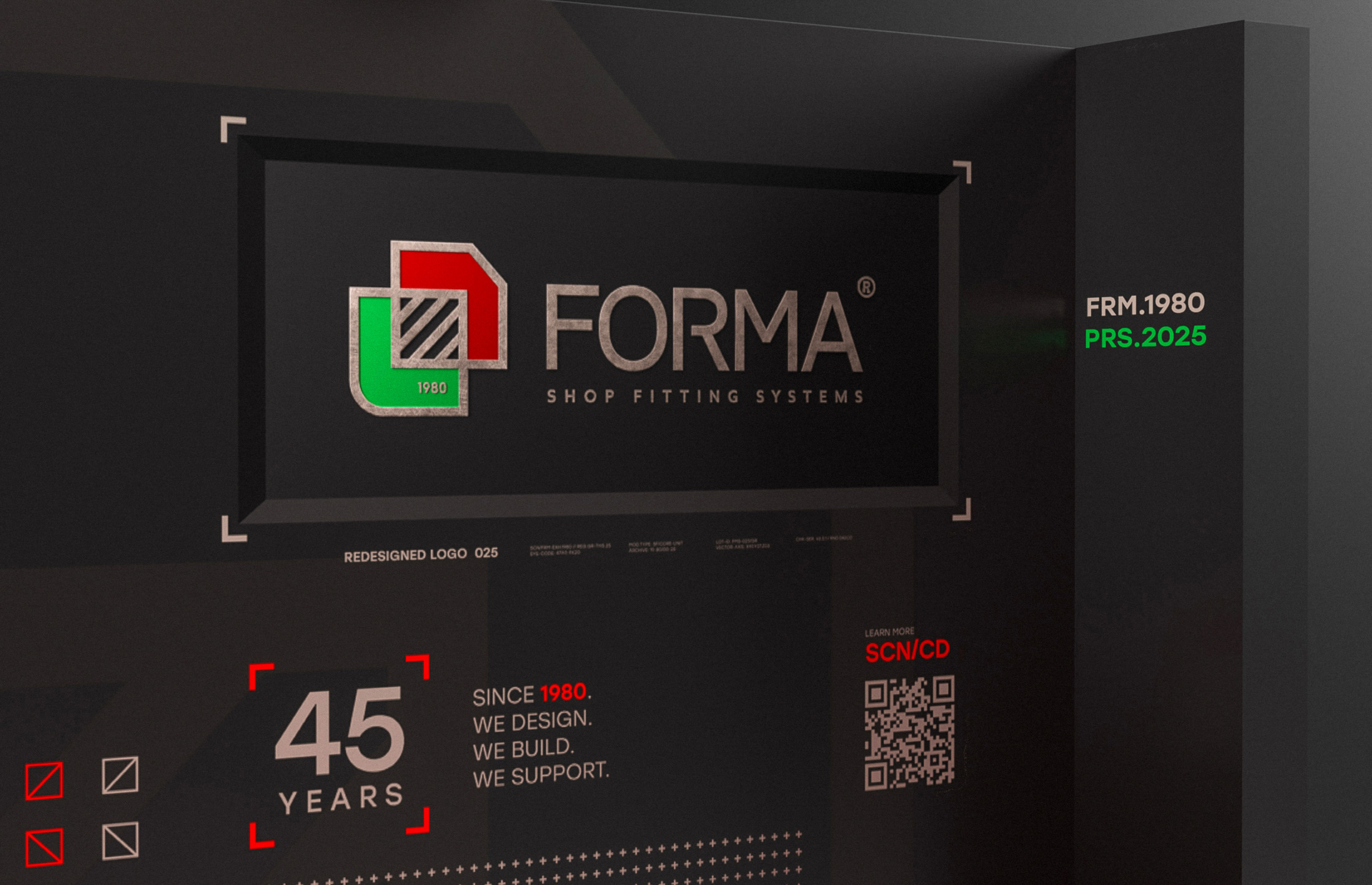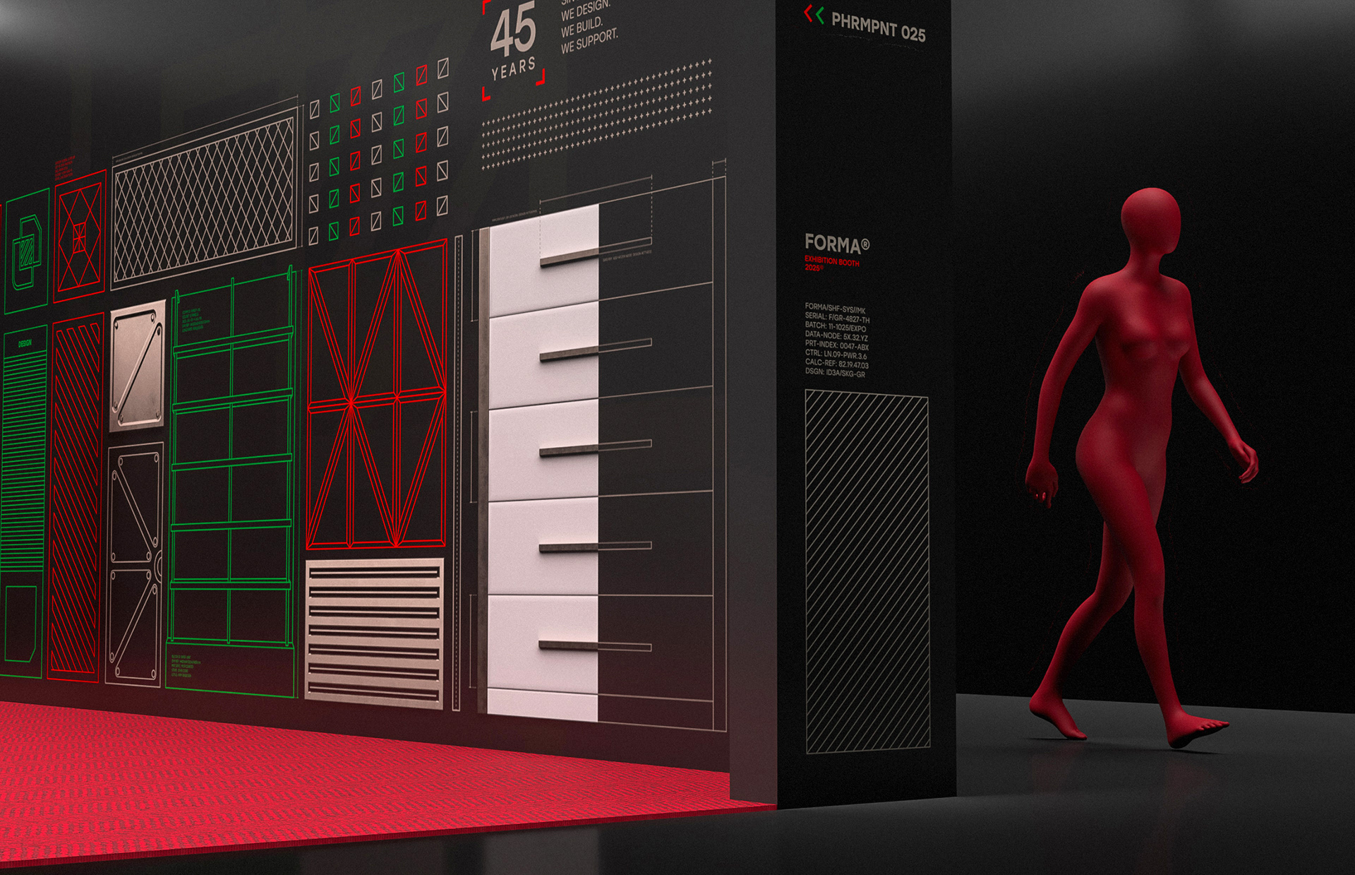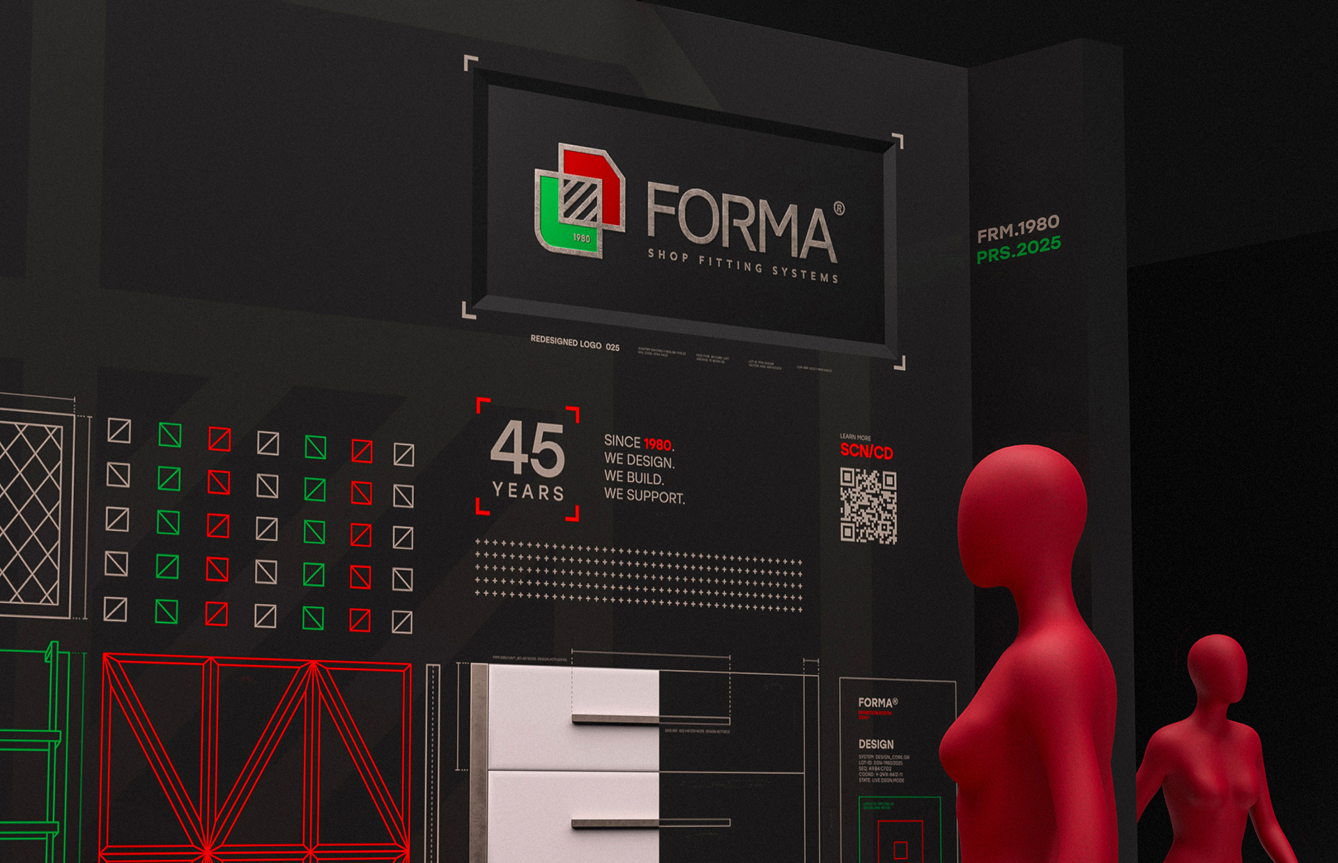Η χρωματική παλέτα του κόκκινου, του πράσινου και του μεταλλικού γκρι προέρχεται από την εταιρική ταυτότητα της FORMA® και αποδίδεται μέσα από μια σύγχρονη ψηφιακή αισθητική. Το περίπτερο λειτουργεί ως ζωντανό διάγραμμα που συνδέει την κληρονομιά της εταιρείας με την πορεία της προς το μέλλον. Αποτελεί μια δήλωση συνέχειας, ακρίβειας και δημιουργικής δύναμης. We Design. We Build. We Support.