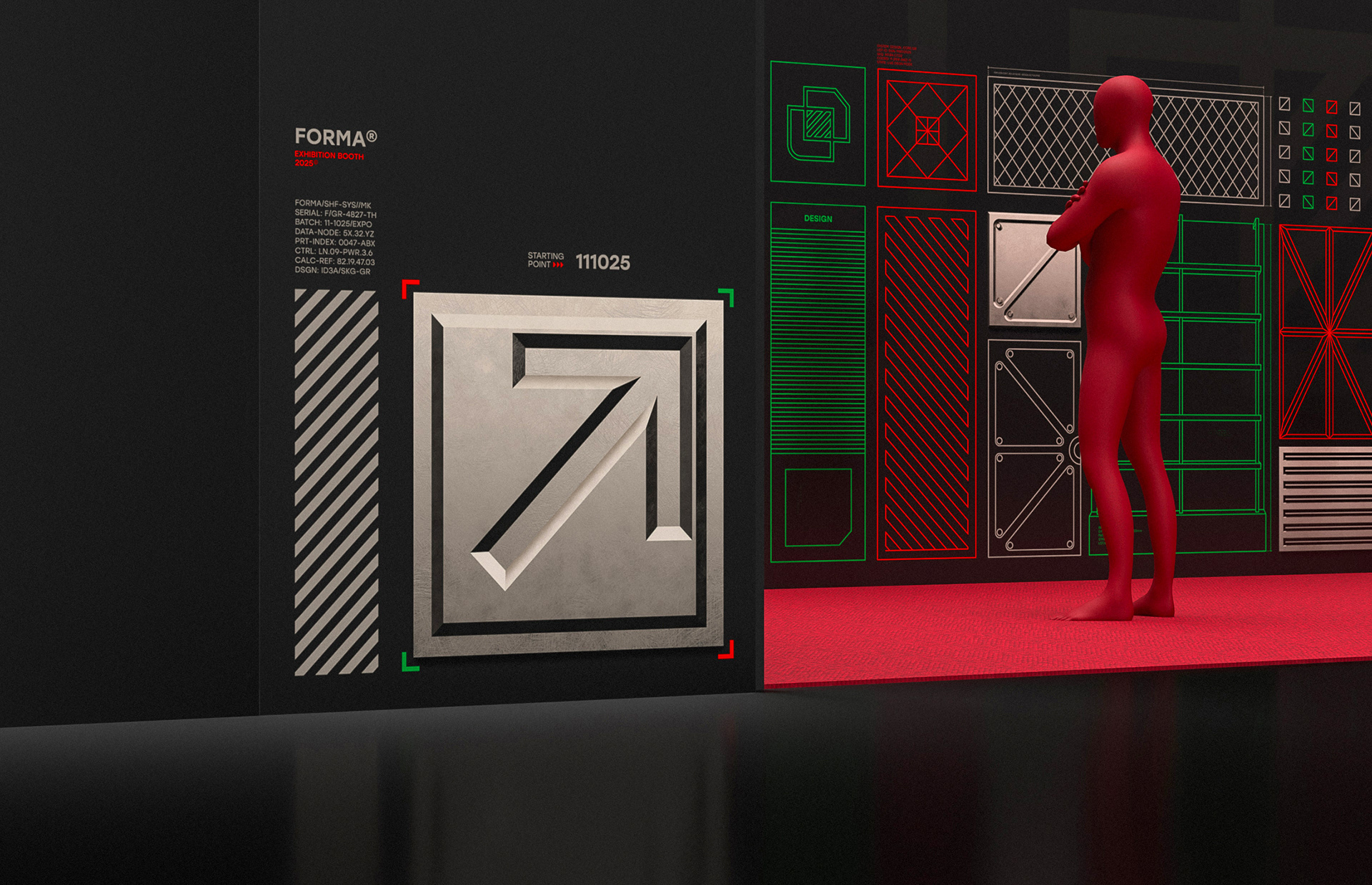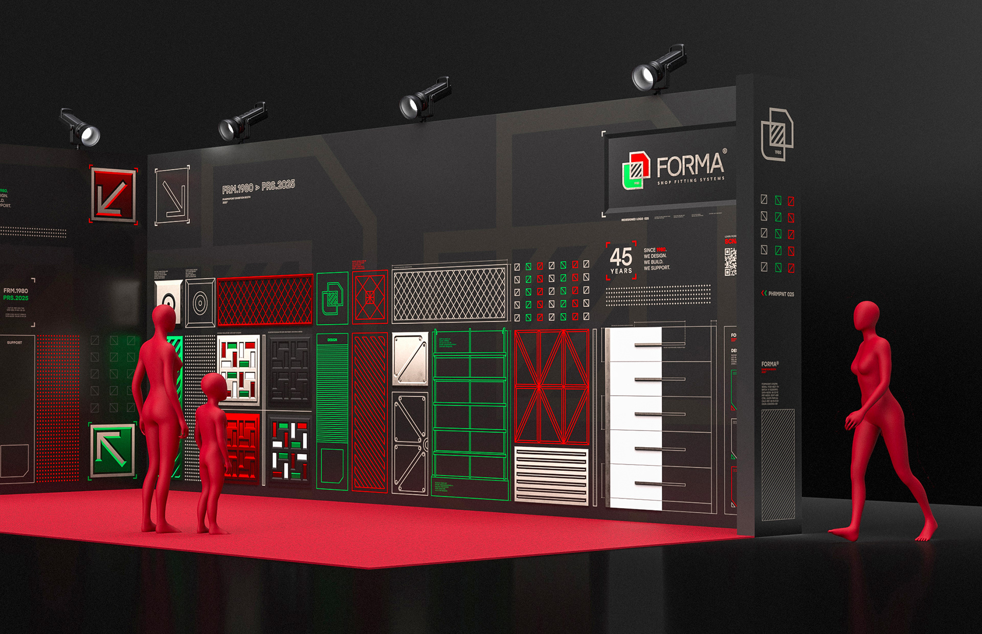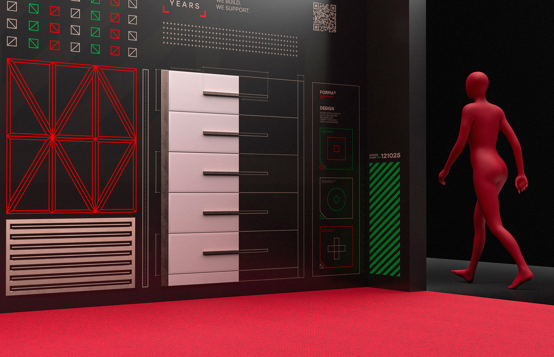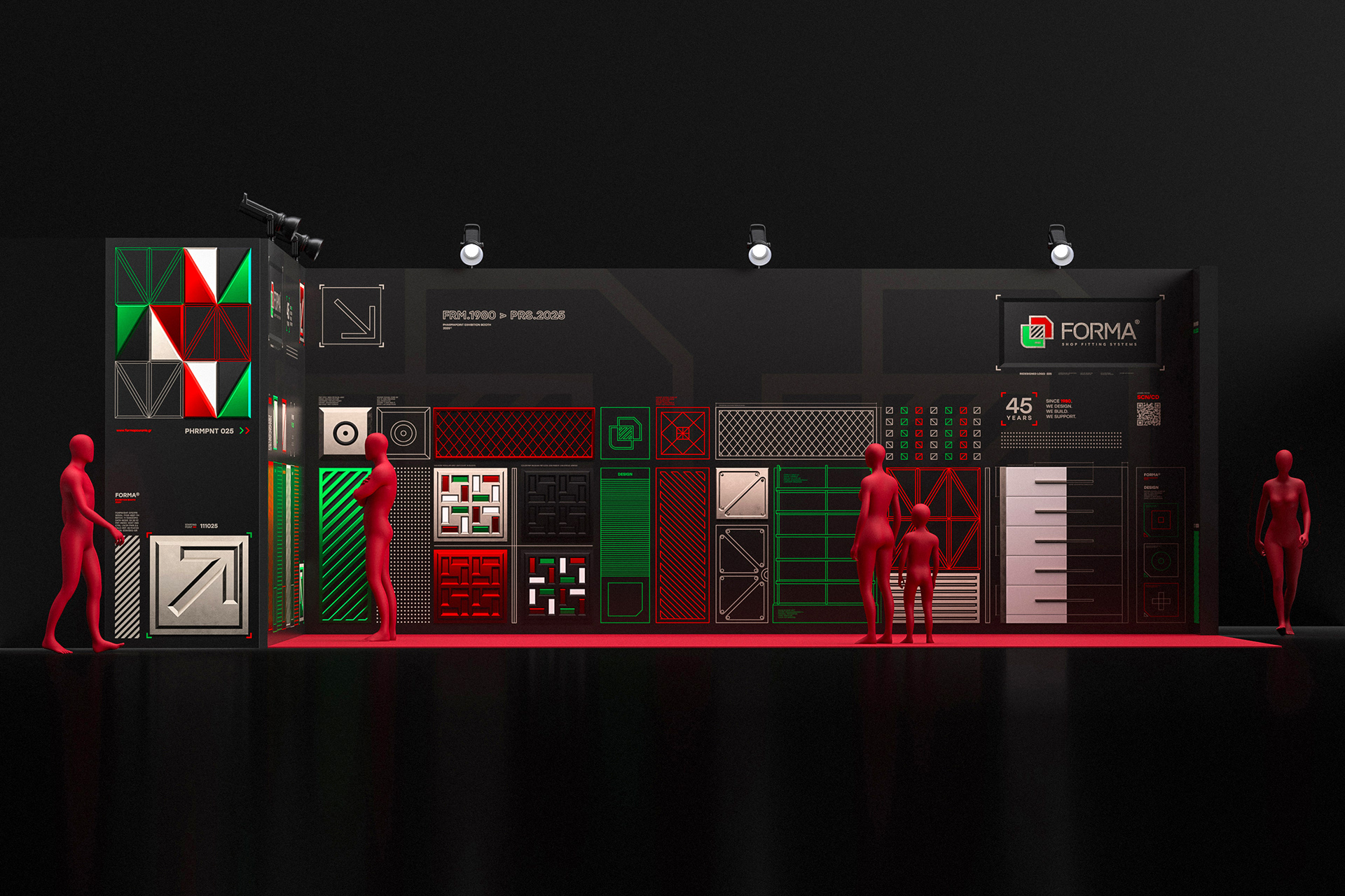 The color palette of red, green and metallic grey derives from FORMA®’s core identity and is expressed through a contemporary digital aesthetic. The booth stands as a living diagram connecting the company’s heritage with its future direction. It represents a clear statement of continuity, precision and creative strength. We Design. We Build. We Support.