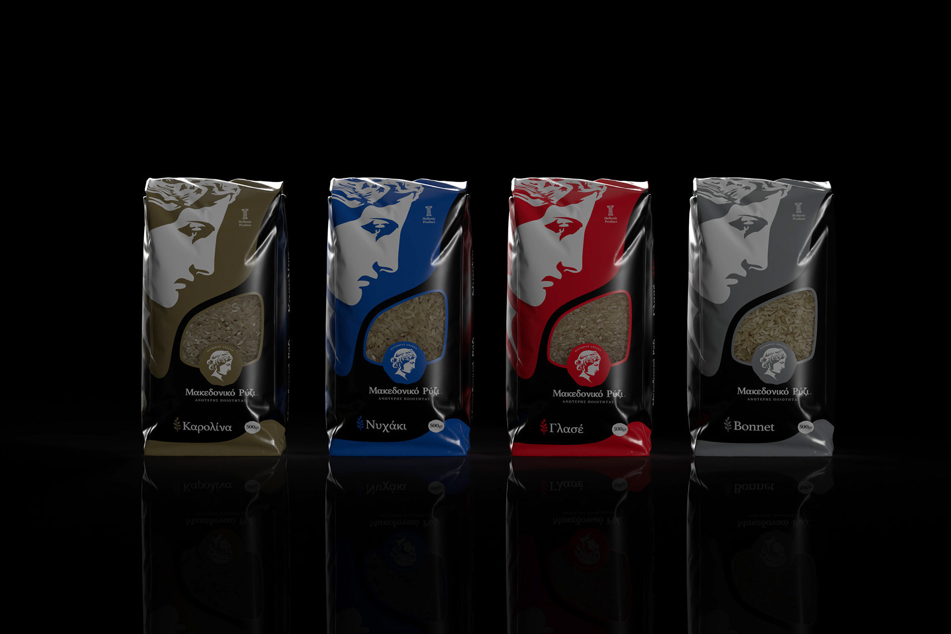 Ο σχεδιασμός συσκευασίας για το Μακεδονικό Ρύζι δημιουργήθηκε ώστε να εκφράσει μια premium ταυτότητα που συνδέει την πολιτιστική κληρονομιά με τη σύγχρονη σχεδιαστική καθαρότητα. Κάθε ποικιλία ρυζιού εντάσσεται σε ένα ενιαίο σύστημα, που διατηρεί τη συνοχή της οικογένειας προϊόντων, ενώ παράλληλα εξασφαλίζει τη διαφοροποίηση. Κεντρικό έμβλημα αποτελεί το προφίλ της Ολυμπιάδας, μητέρας του Μεγάλου Αλεξάνδρου, αποδοσμένο σε έντονη και μινιμαλιστική σιλουέτα, που συμβολίζει την αυθεντικότητα, την κληρονομιά και την ανώτερη ποιότητα. Το βαθύ μαύρο φόντο ενισχύει την κομψότητα και την αντίθεση, ενώ το διάφανο παράθυρο αναδεικνύει το ίδιο το προϊόν ως αναπόσπαστο μέρος της σύνθεσης. Η τυπογραφία ισορροπεί ανάμεσα σε κλασικές και σύγχρονες αναφορές, διασφαλίζοντας σαφήνεια και τοποθετώντας το brand με διαχρονικό κύρος και σύγχρονη παρουσία.